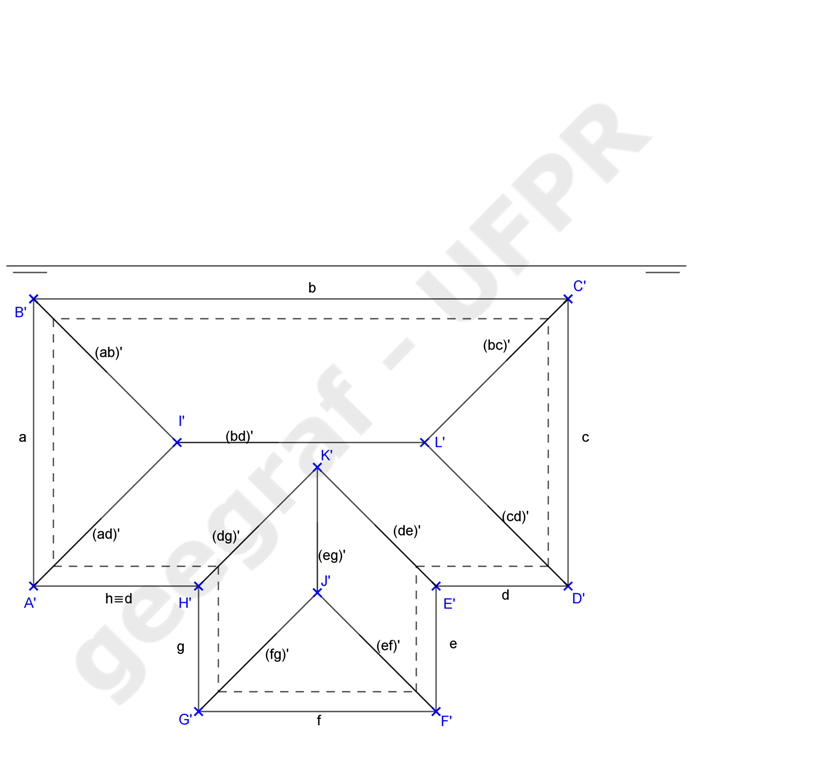 De G' sairá a interseção entre as águas b e f. Como as horizontais dessas águas são paralelas, a interseção procurada será também paralela, ou seja, será uma fronto-horizontal e, portanto, uma cumeeira. Desenhe o segmento (bf)' paralelo às laterais b e f da poligonal passando pelo ponto G'.