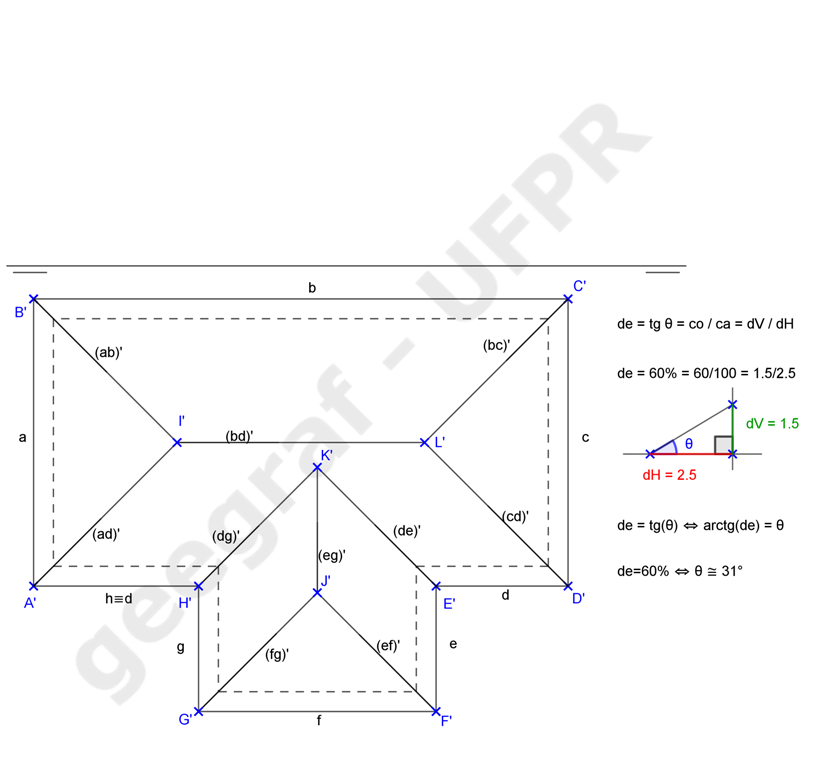 Como todas as águas possuem a mesma inclinação com π' então vamos usar o método das bissetrizes para encontrar as primeiras projeções das interseções entre as águas adjacentes.