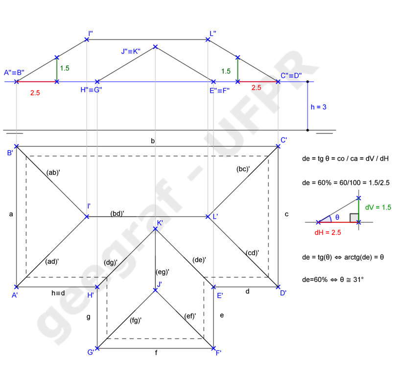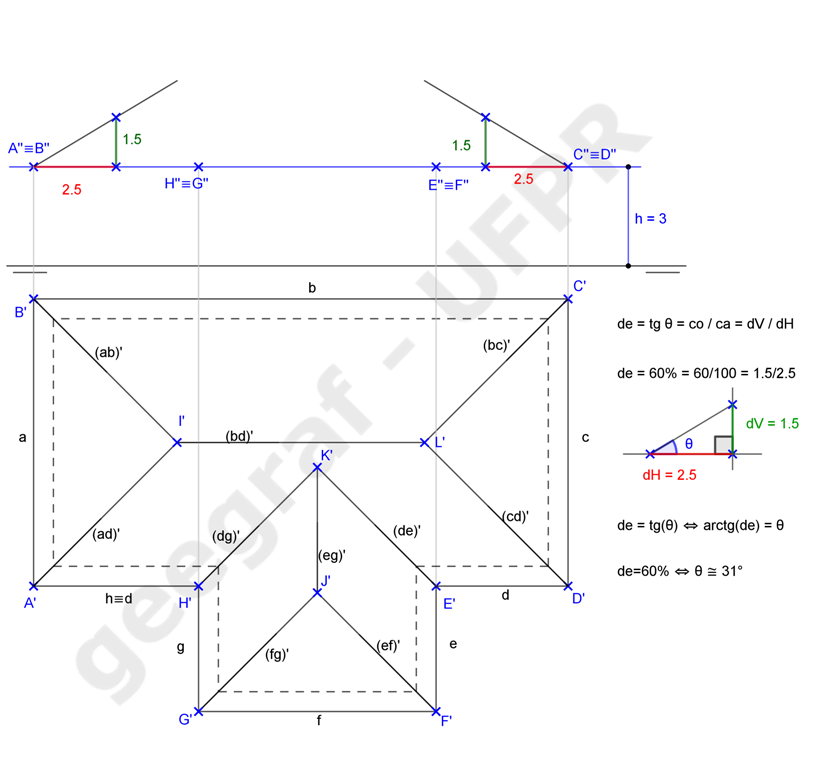 Para representar a fachada principal iniciamos obtendo as segundas projeções dos pontos da poligonal ABCDEFGH que está na cota 3m. Representamos o segundo traço do plano de topo a que contém a reta AB e possui a declividade de 60% em relação a π', para isso, basta construir um triângulo retângulo de catetos 2,5 e 1,5.