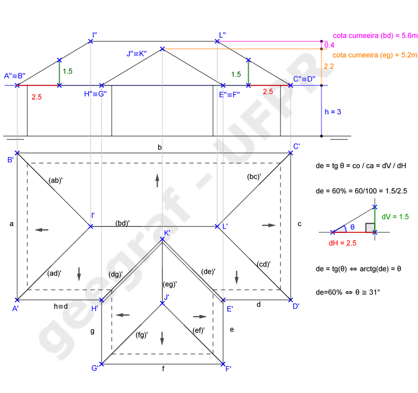 Esse telhado possui um rincão: (ef) e duas cumeeiras: (ce) e (bf). A cota da cumeeira (ce) é 3,9m.
