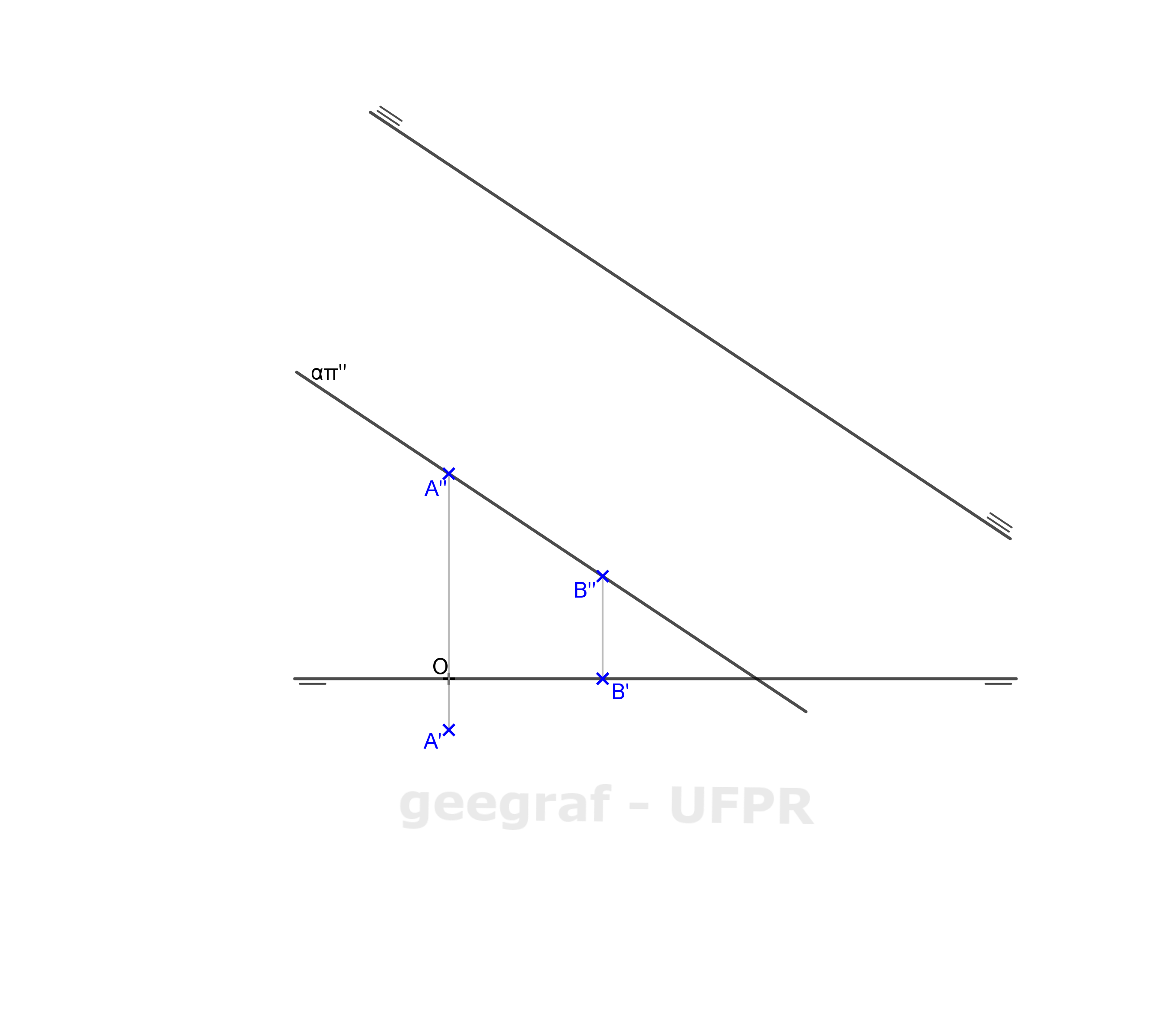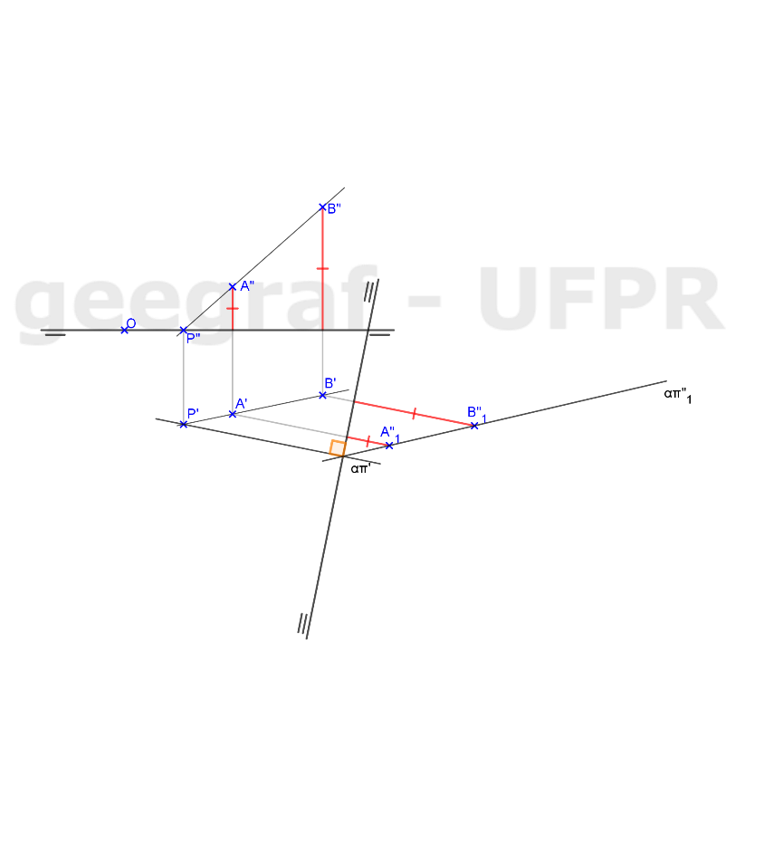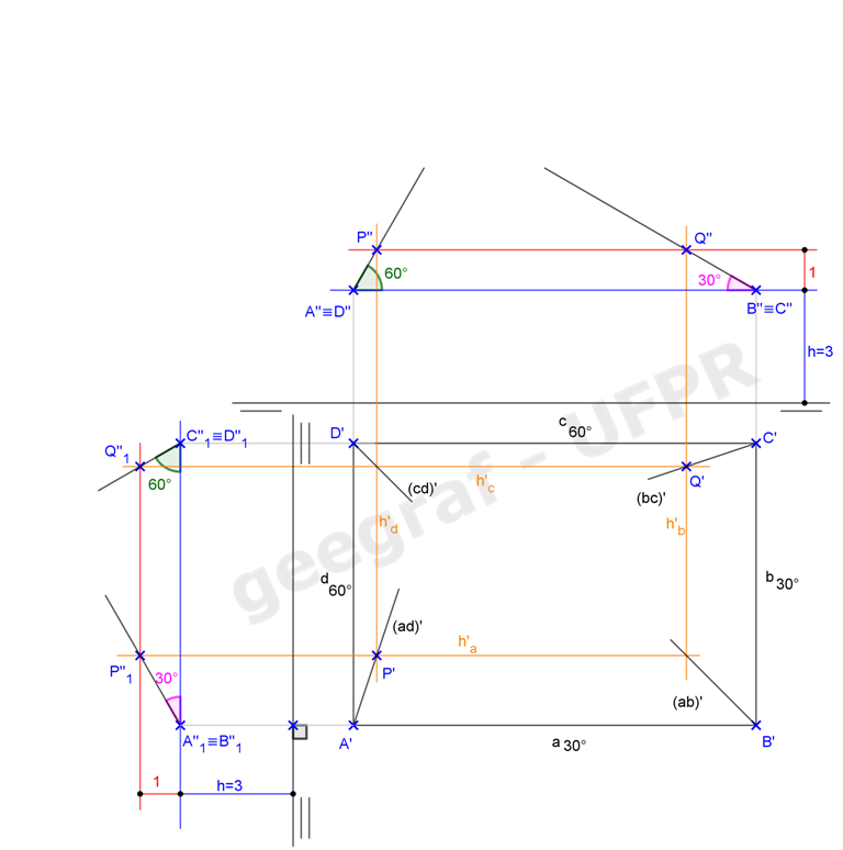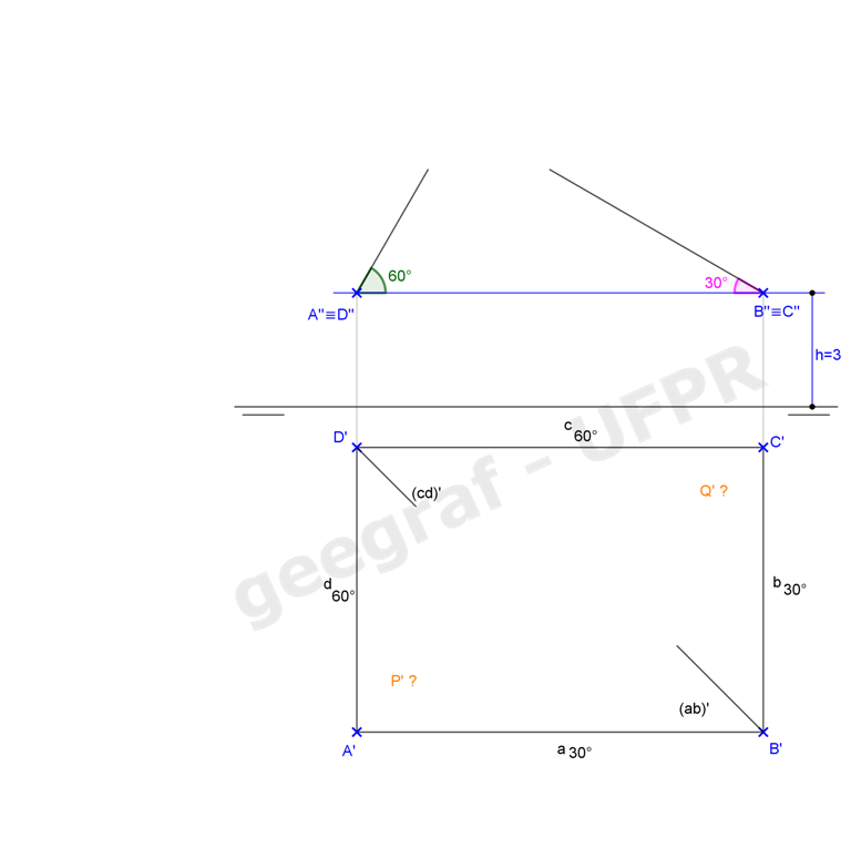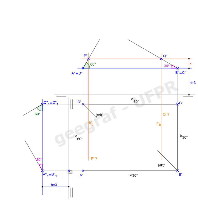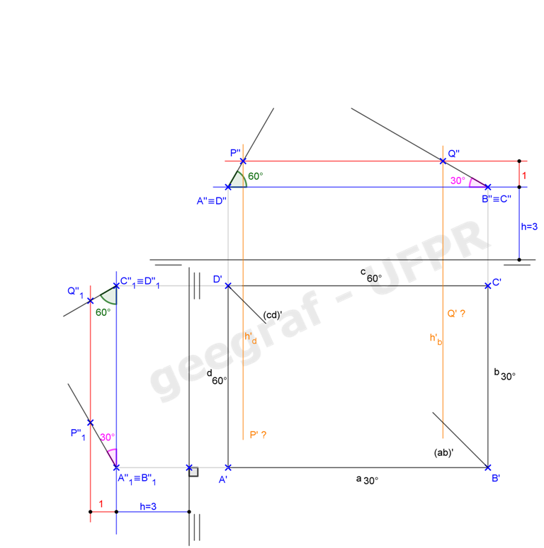 Obtemos por MPV as novas segundas projeções dos pontos A, B, C e D. Representamos o novo segundo traço do plano a, que nesse 2º sistema é de topo, que contém a reta AB e faz 30° com π'.Representamos o novo segundo traço do plano c, que nesse 2º sistema é de topo, que contém a reta CD e faz 60° com π'.