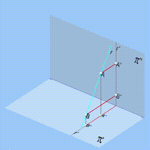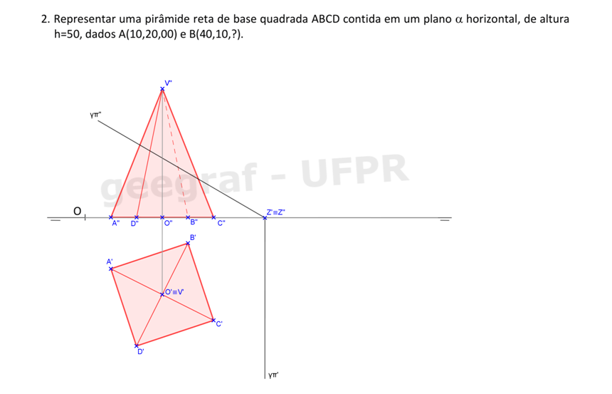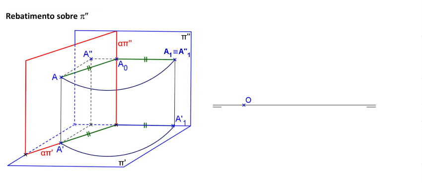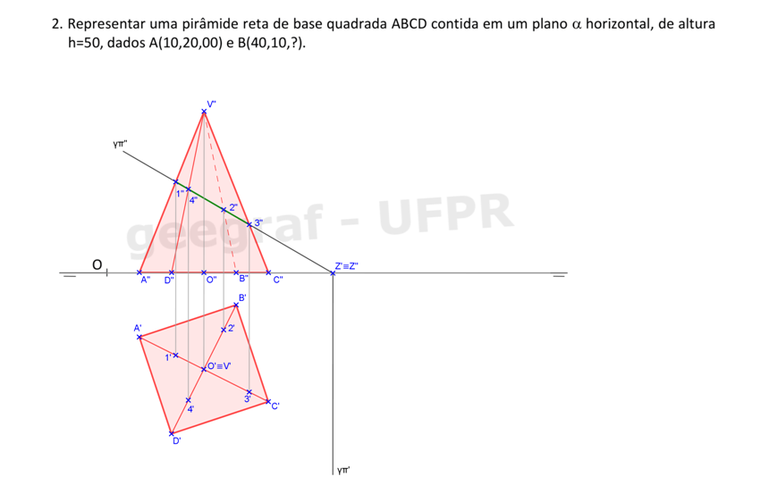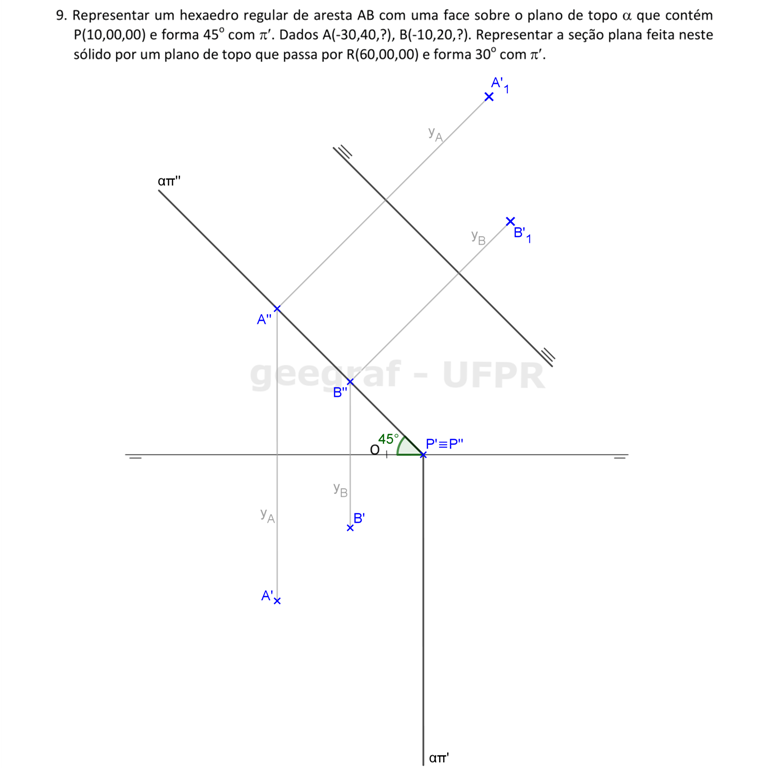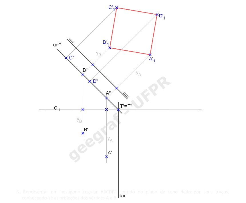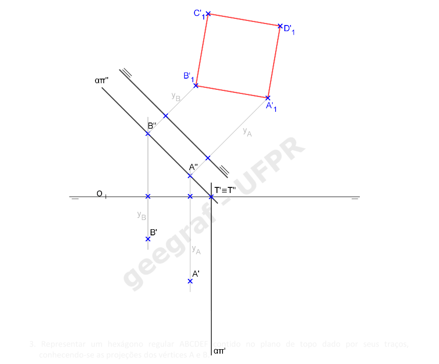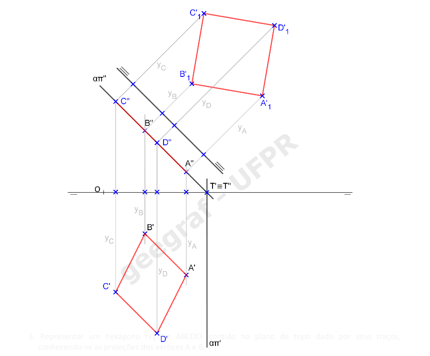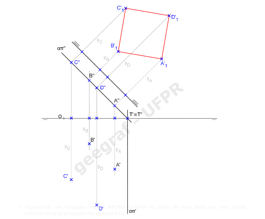 Obtemos por MPV as novas segundas projeções dos pontos A, B, C e D. Representamos o novo segundo traço do plano a, que nesse 2º sistema é de topo, que contém a reta AB e faz 30° com π'.Representamos o novo segundo traço do plano c, que nesse 2º sistema é de topo, que contém a reta CD e faz 60° com π'.