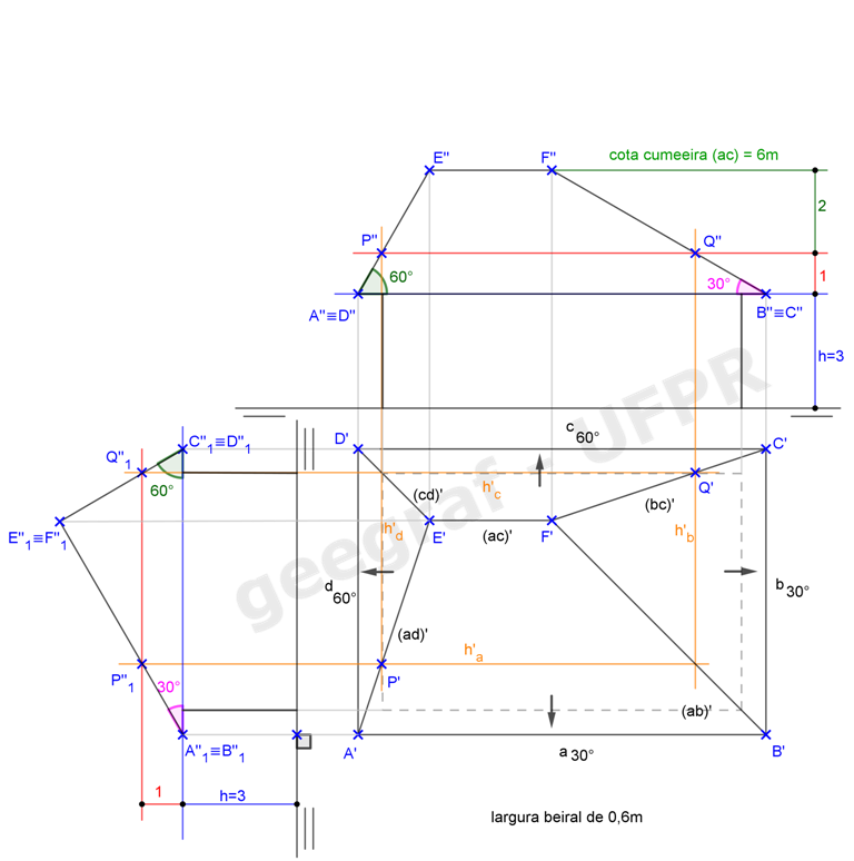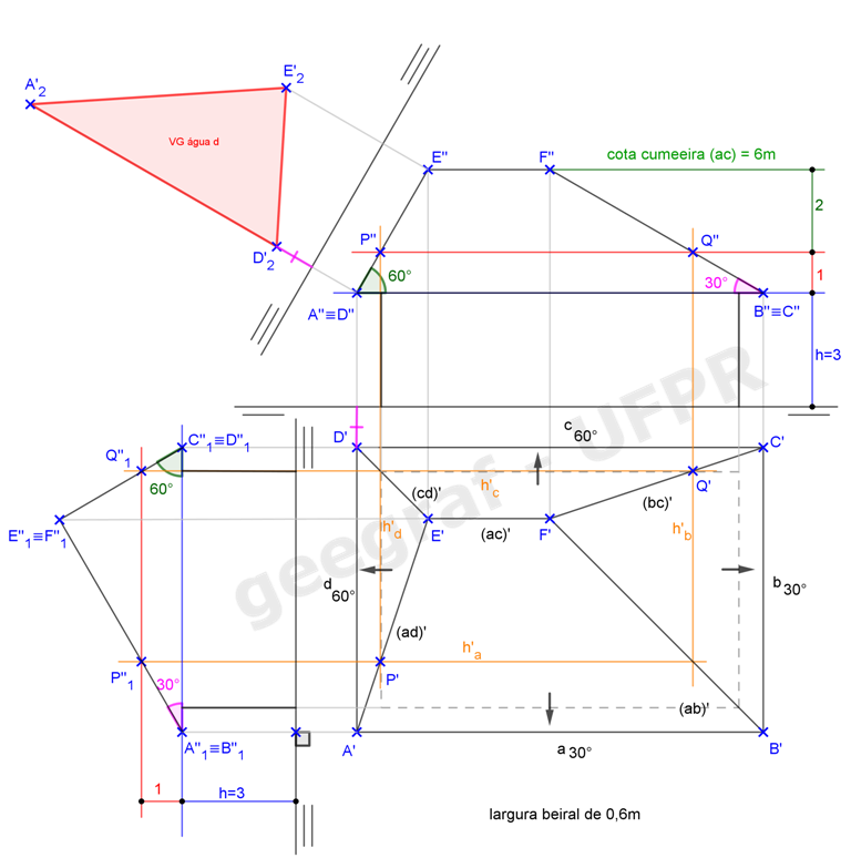 Queremos obter as interseções entre os planos que contém as águas a, b, c e d. Podemos iniciar aplicando o método das bissetrizes para obter as interseções (ab) e (cd) pois as águas a e b possuem a mesma inclinação de 30° e c e d de 60°.