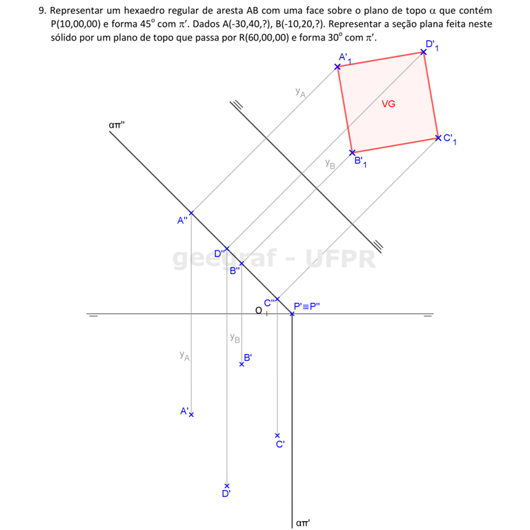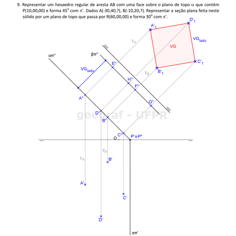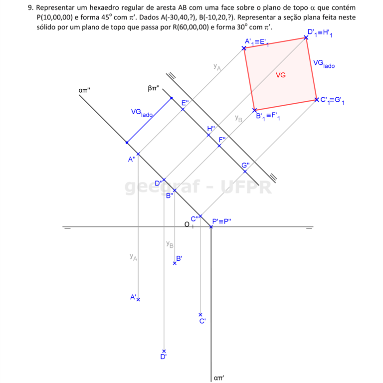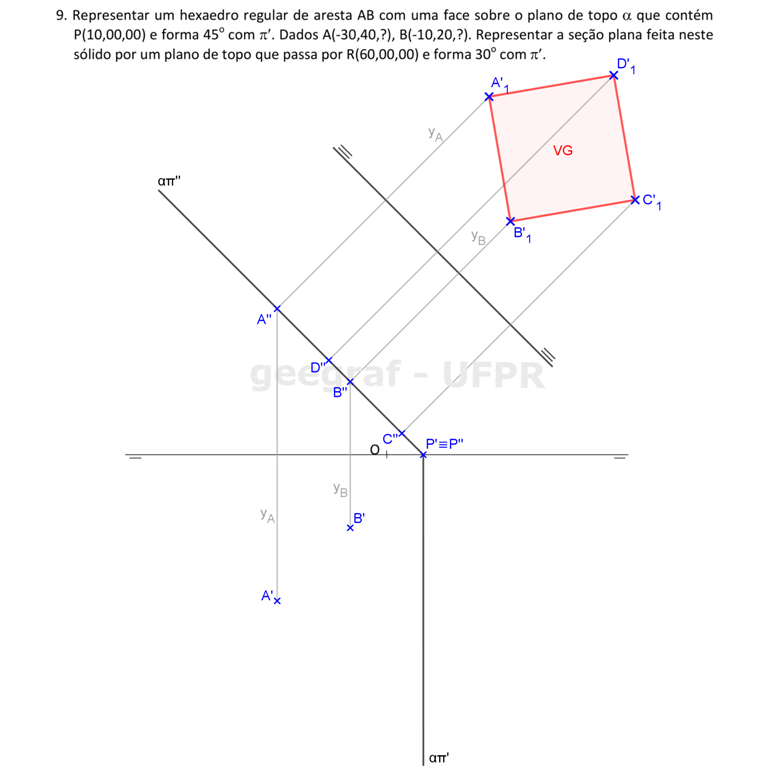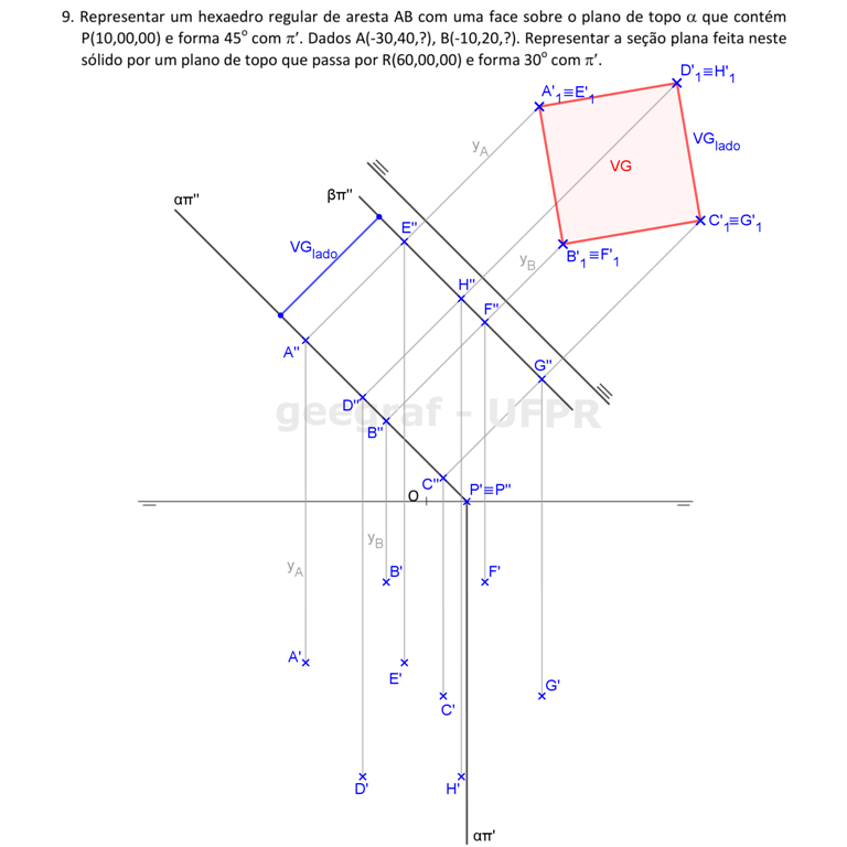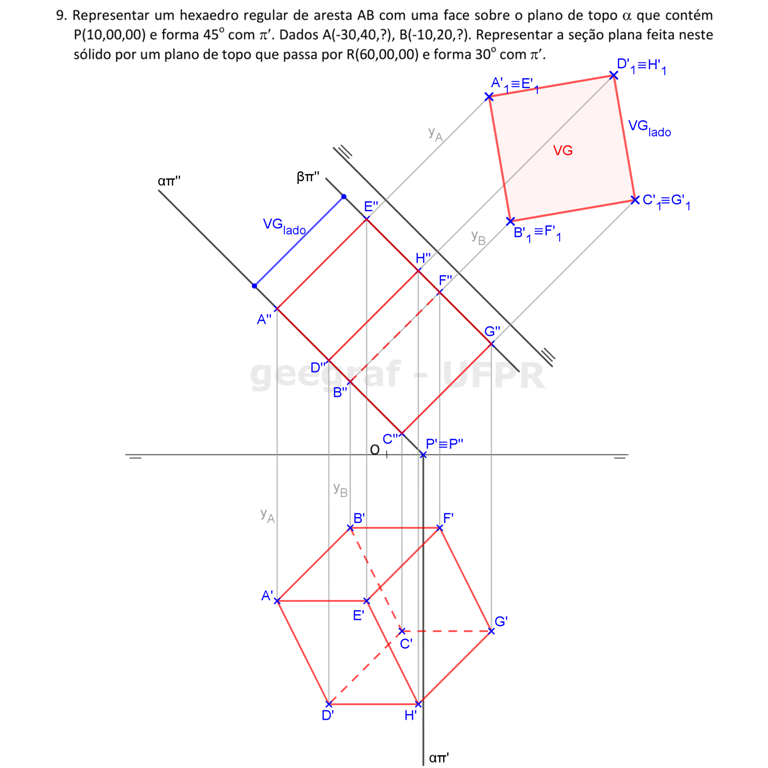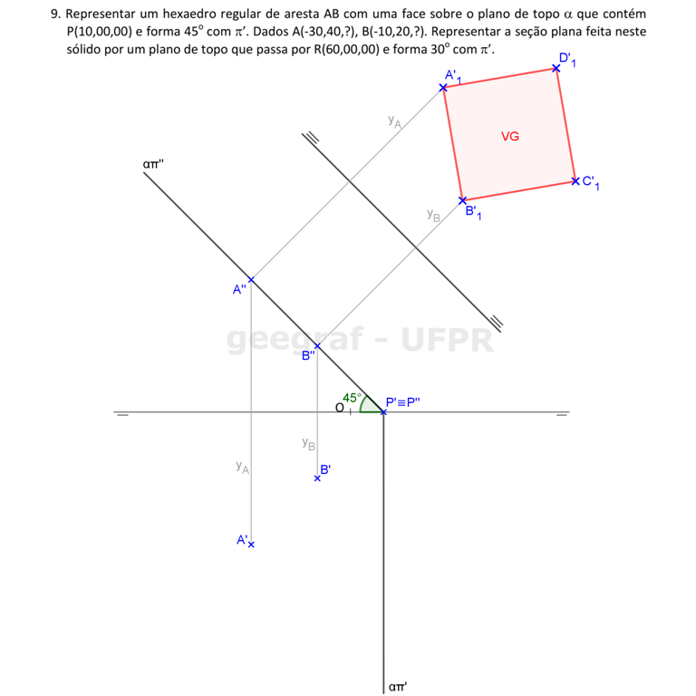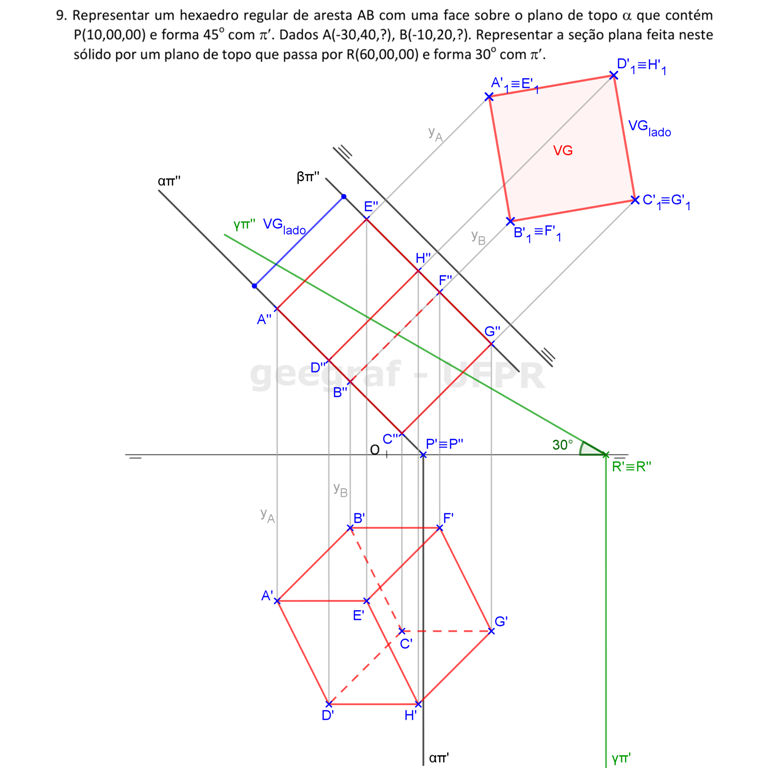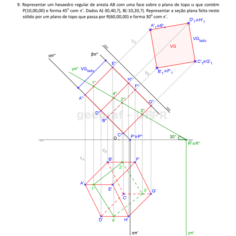 Representamos o segundo traço do plano de topo a que contém a reta AB e faz 30° com π'. Como G pertence ao plano a de topo, fazemos sua LC e encontramos sua segunda projeção no segundo traço do plano a.