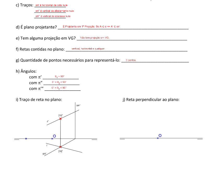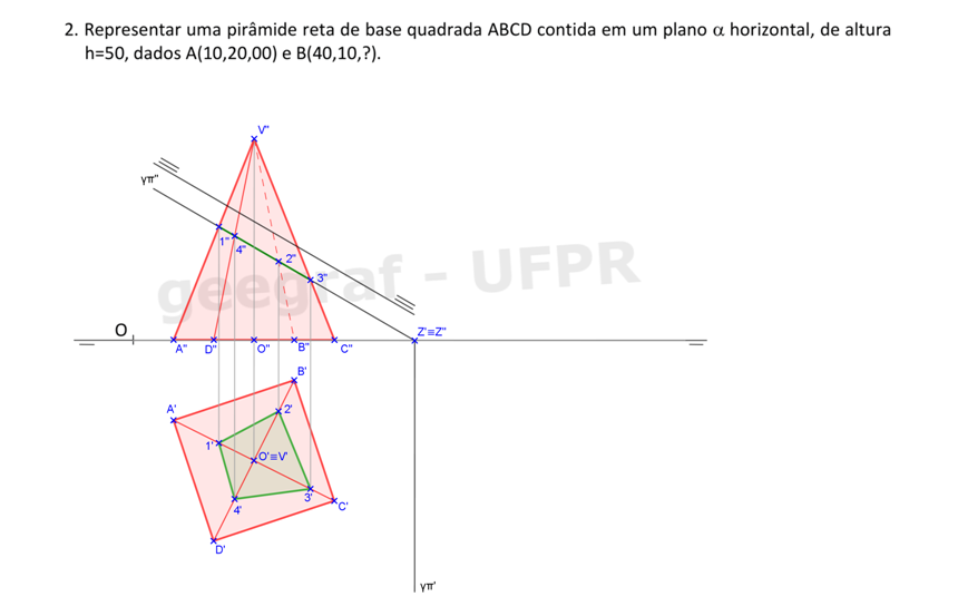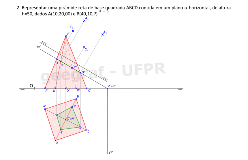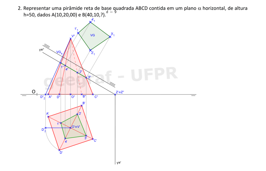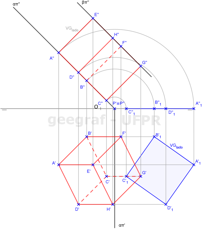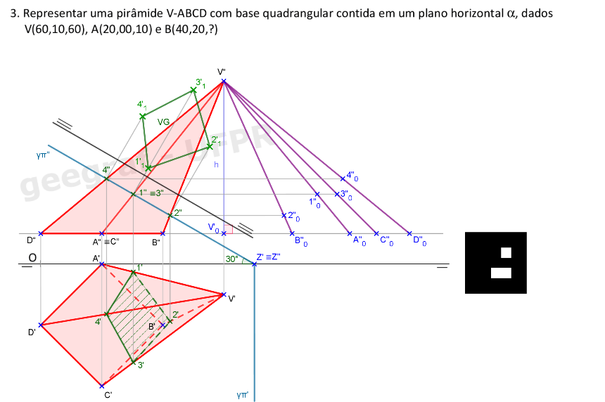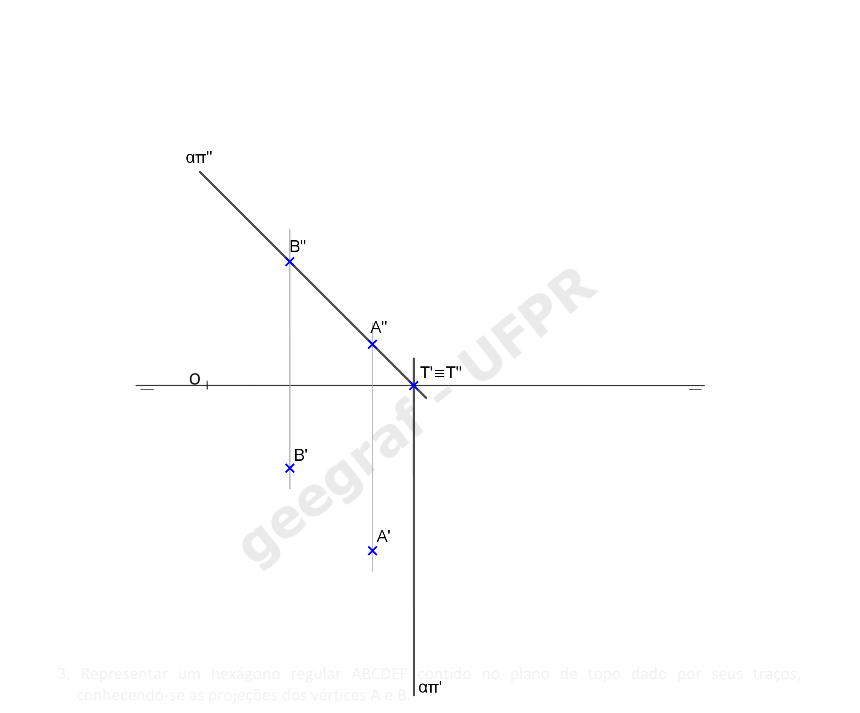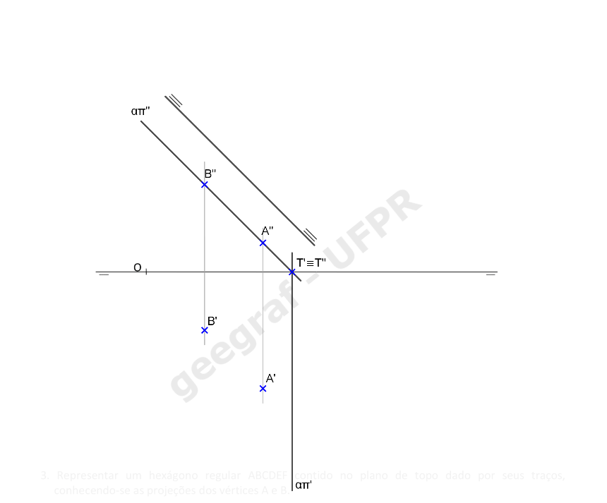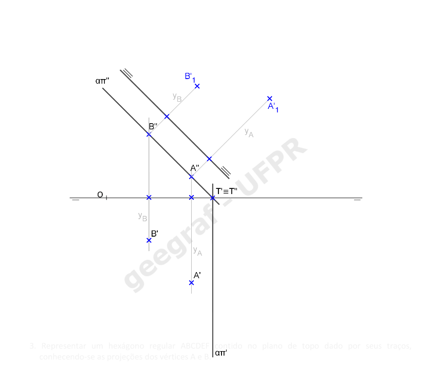 Representamos o segundo traço do plano de topo a que contém a reta AB e faz 30° com π'. Como G pertence ao plano a de topo, fazemos sua LC e encontramos sua segunda projeção no segundo traço do plano a.