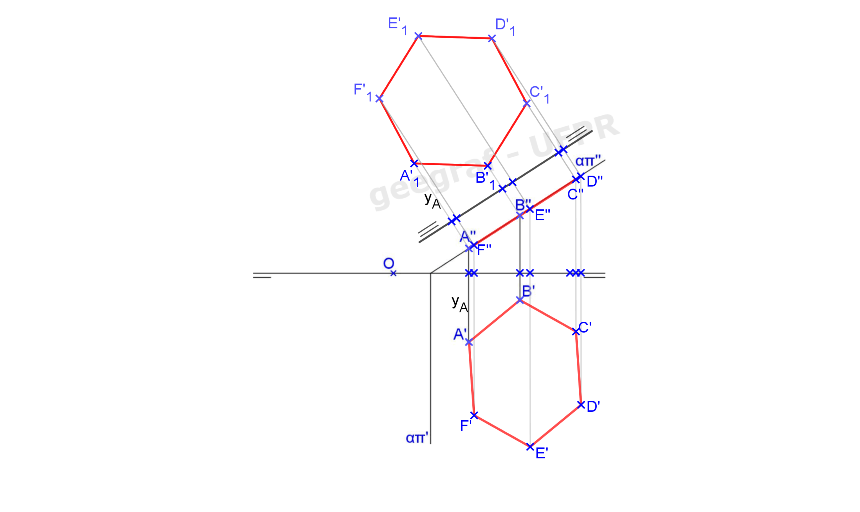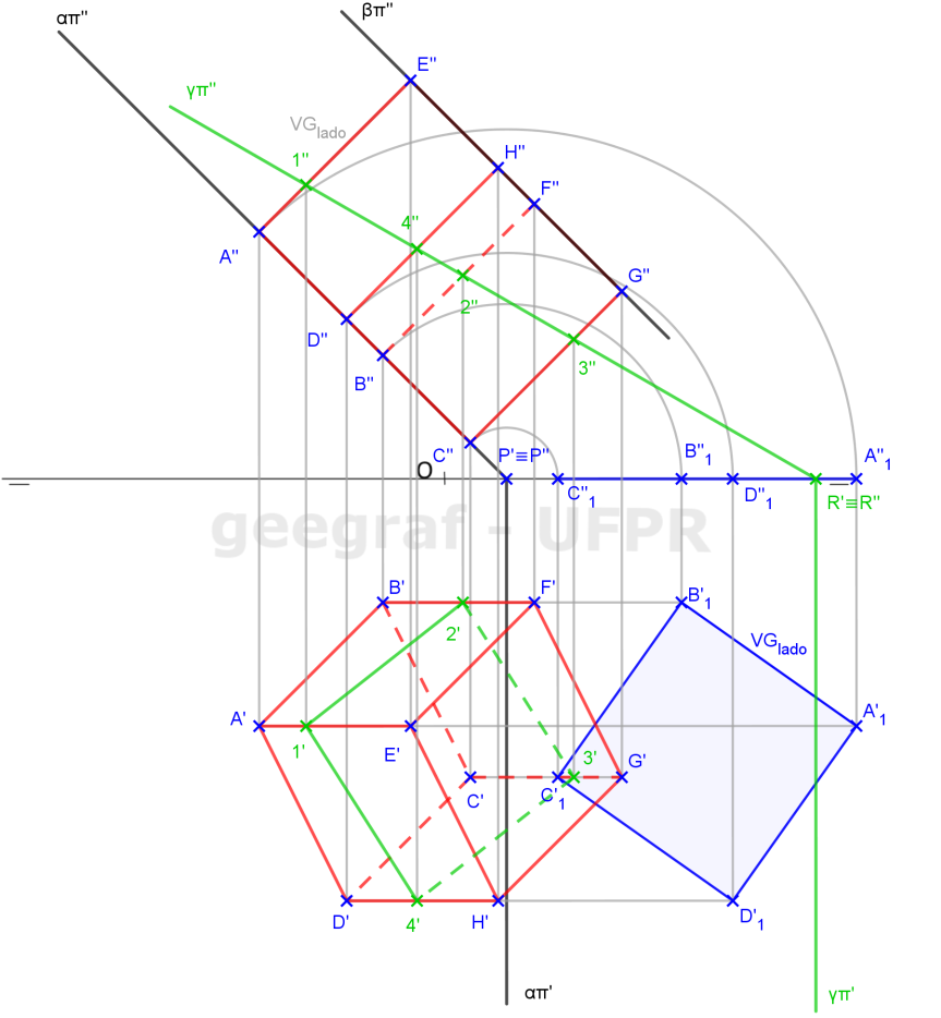 Tanto o ponto J como o H pertencem às águas c e f, assim unindo H' e J' teremos (cf)'. Pronto! Representamos as primeiras projeções de todas as interseções!