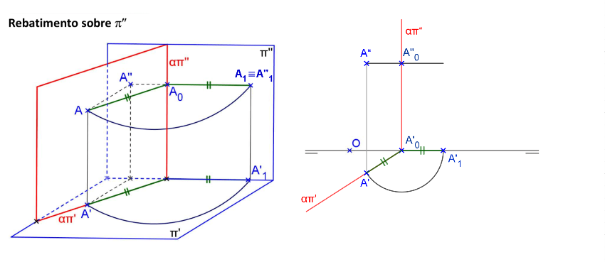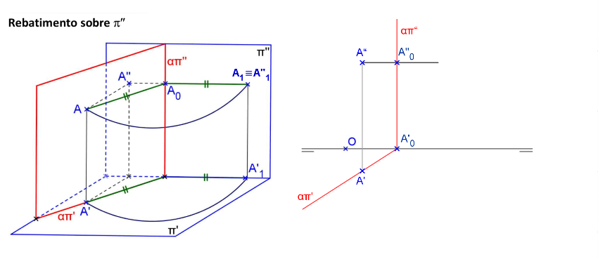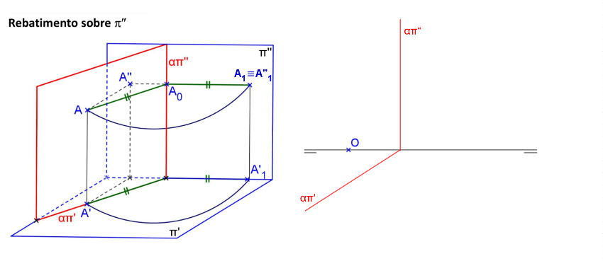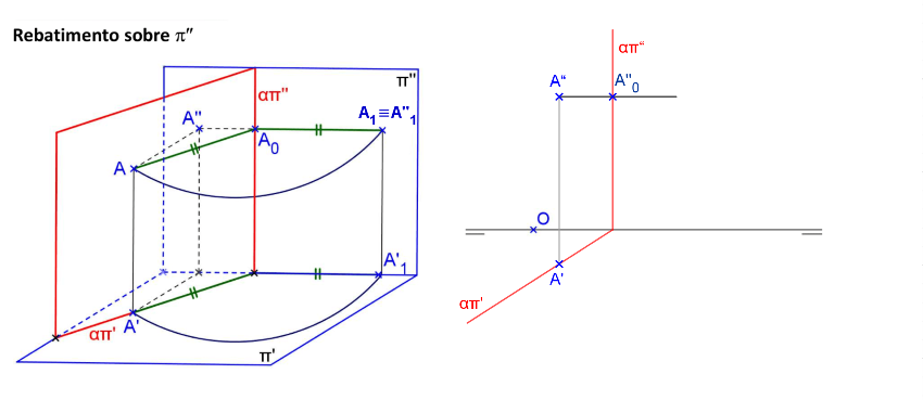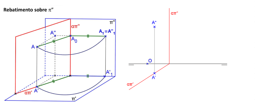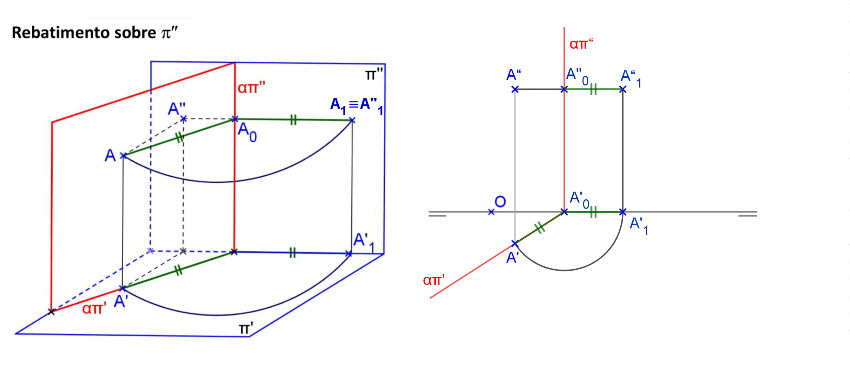Vamos rebater o plano vertical a partir do eixo que está na horizontal. Em cada ponto obtido no passo anterior construa perpendiculares à reta A'B' e marque no sistema de eixos a cota correspondente.