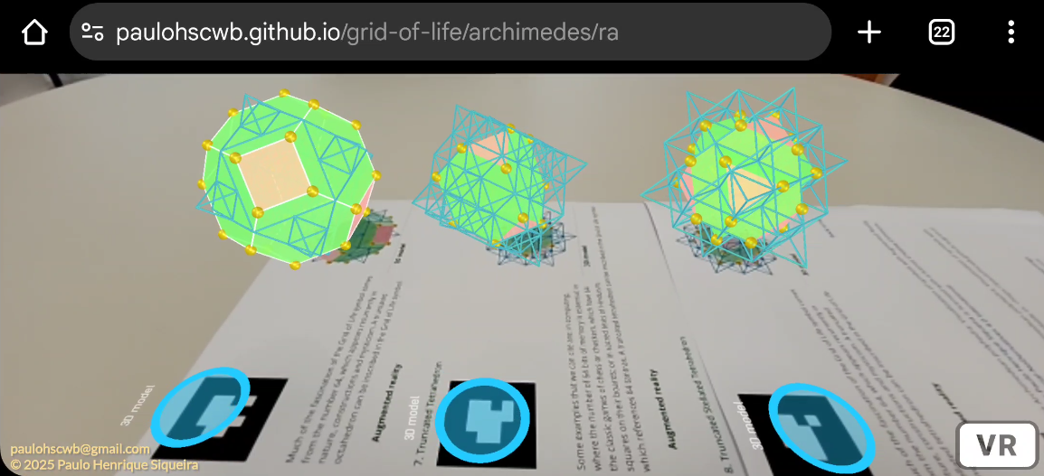 Siqueira, P.H., "Visualization of polyhedra in Grid of Life symbol with Augmented Reality and Virtual Reality". Disponível em: <https://paulohscwb.github.io/grid-of-life/>, Fevereiro de 2025.
