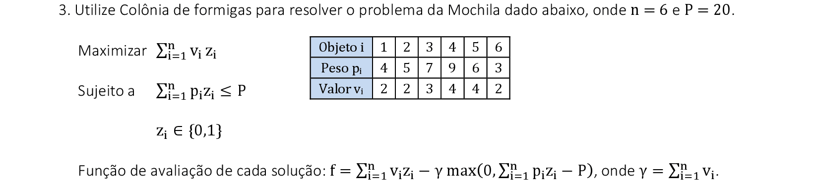 Como o problema é de minimização, vamos usar como fitness fj = (max{rotak} + 1) - rotaj. Desta forma, soluções com menores valores nos fornecem maiores probabilidades pj.